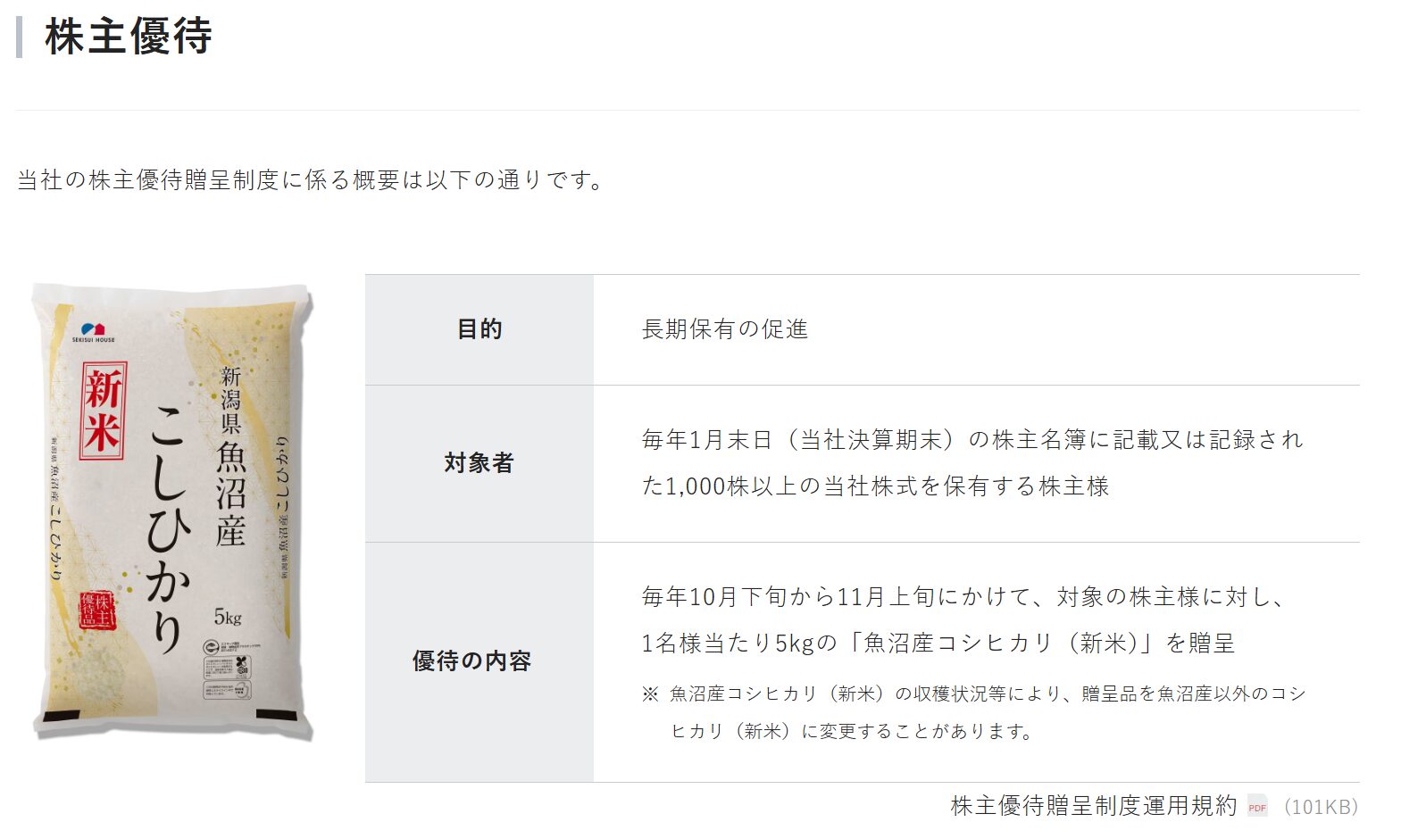 積水ハウス(1928)の株主優待は、1,000株以上の保有で、収穫されたばかりの「魚沼産コシヒカリ(新米)5kg」が贈呈されます。お米券ではなく現物のお米が自宅へ配送されます。