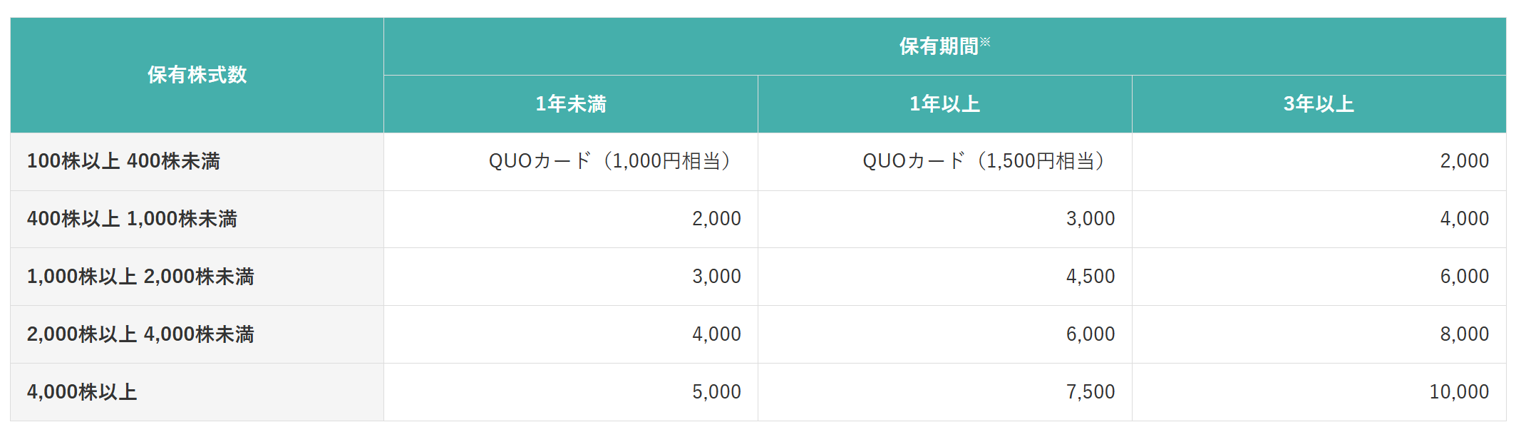 | 4,000株 | クオカード 5,000円分 | クオカード 7,500円分 | カタログギフト 10,000円相当 (カタログからクオカード10,000円を選択可能) |