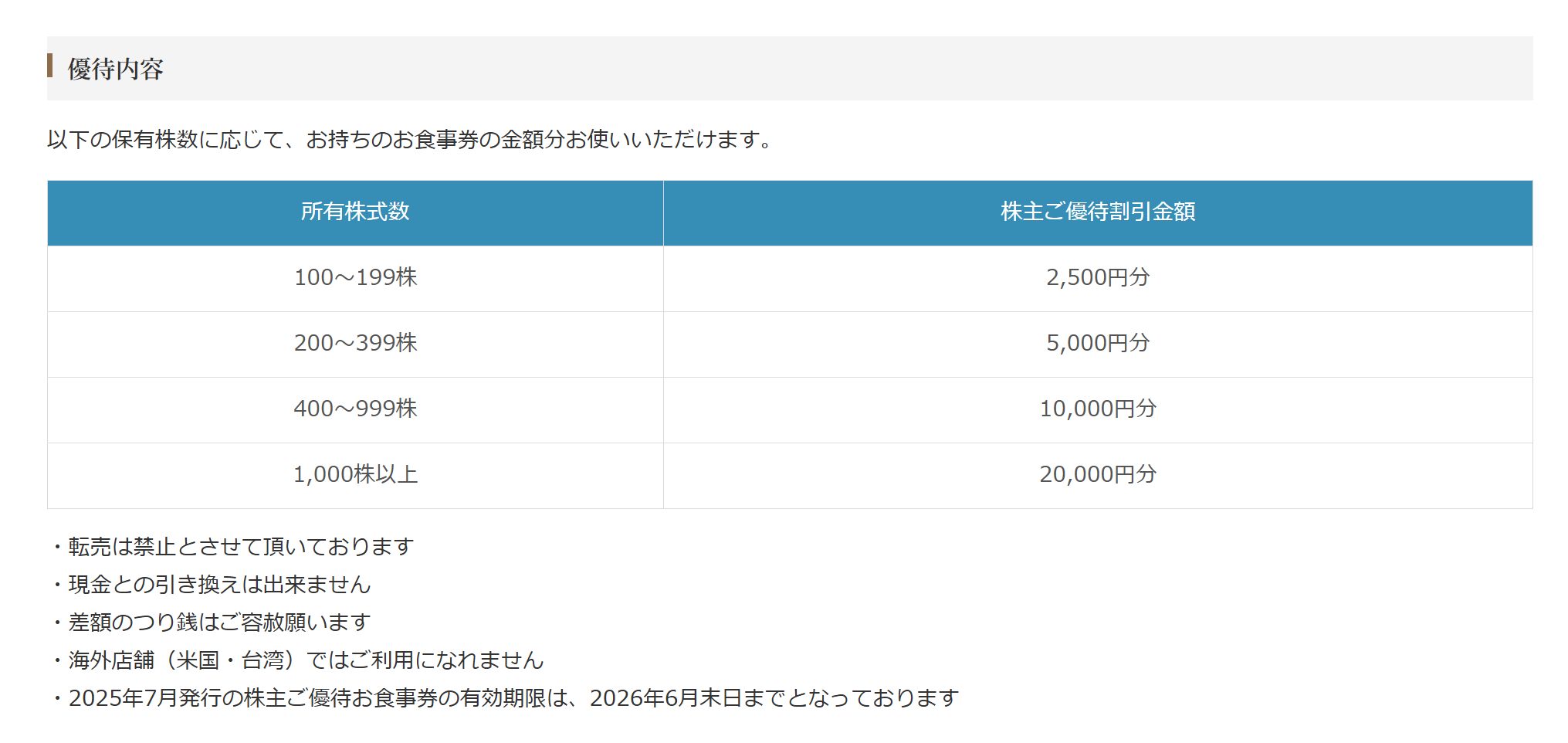 2025年権利分から株主優待拡充となり、割引券ではなく食事券になったので