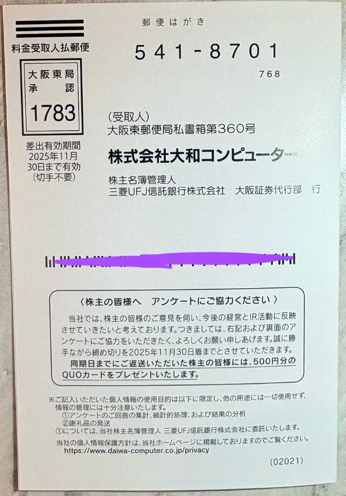 私自身も「いつかなくなるかも?」というリスクは承知の上で、妻や子供の口座を含めて家族全員分で1株ずつ現物保有しています👨👩👧👦 秋ごろに届く「議決権行使書」に同封されているアンケートハガキに答えて返送するだけで、忘れたころにQUOカードが届くのですが、このプレゼント感がたまりません。