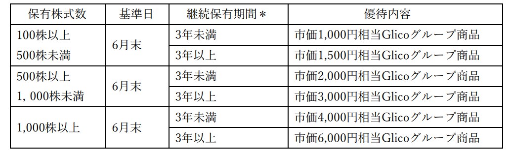 ・2026年6月30日権利分より、対象株主への優待品(Glicoグループ商品)は現行より増額されます。