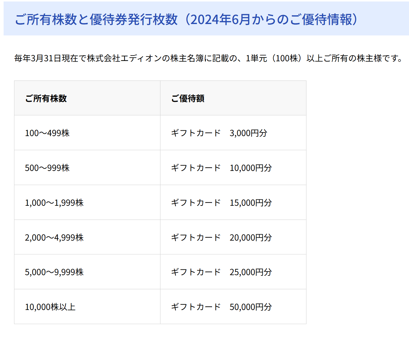 | 優待内容 | 店頭もしくはWebで使用できる株主優待券 |