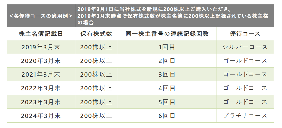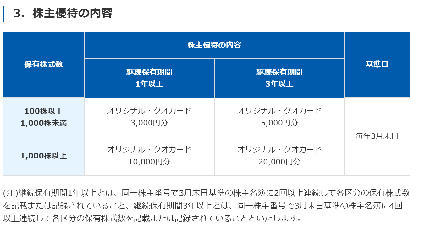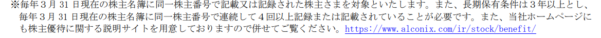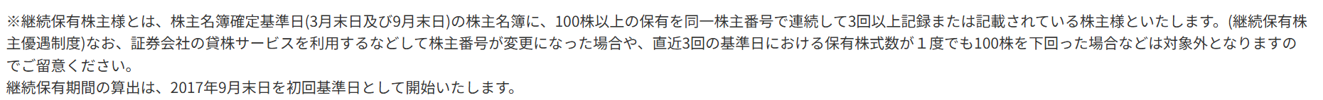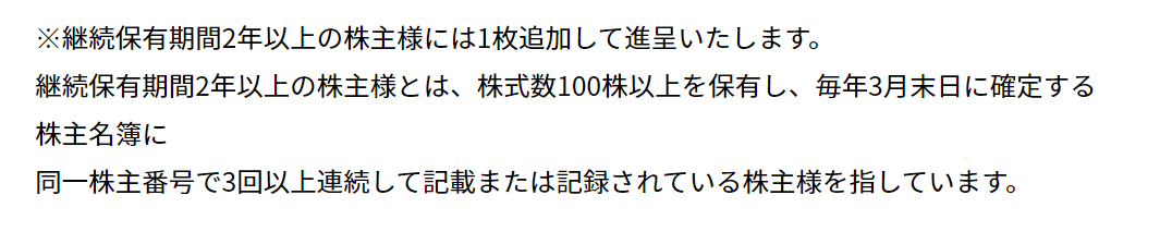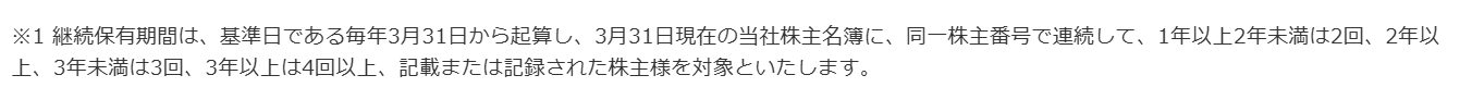 | 条件詳細 (会社HP) | ※「1年以上継続保有」の条件は、年2回(4月、10月)確定する株主名簿に同じ株主番号で3回以上連続で記載されることといたします。 |