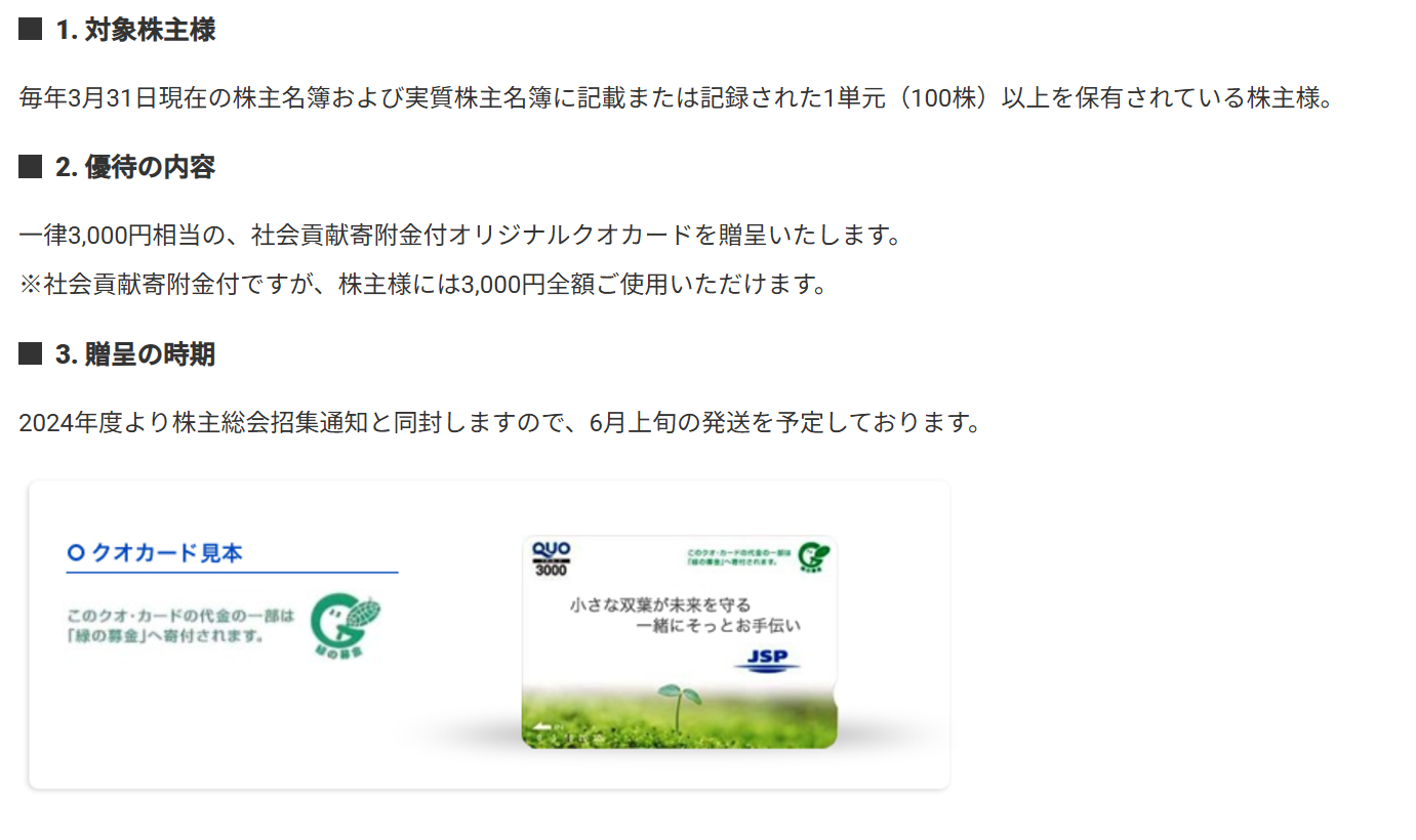 | 優待内容 | カタログギフト(クオカード含) ※下記画像参照 (2024年3月時点) |