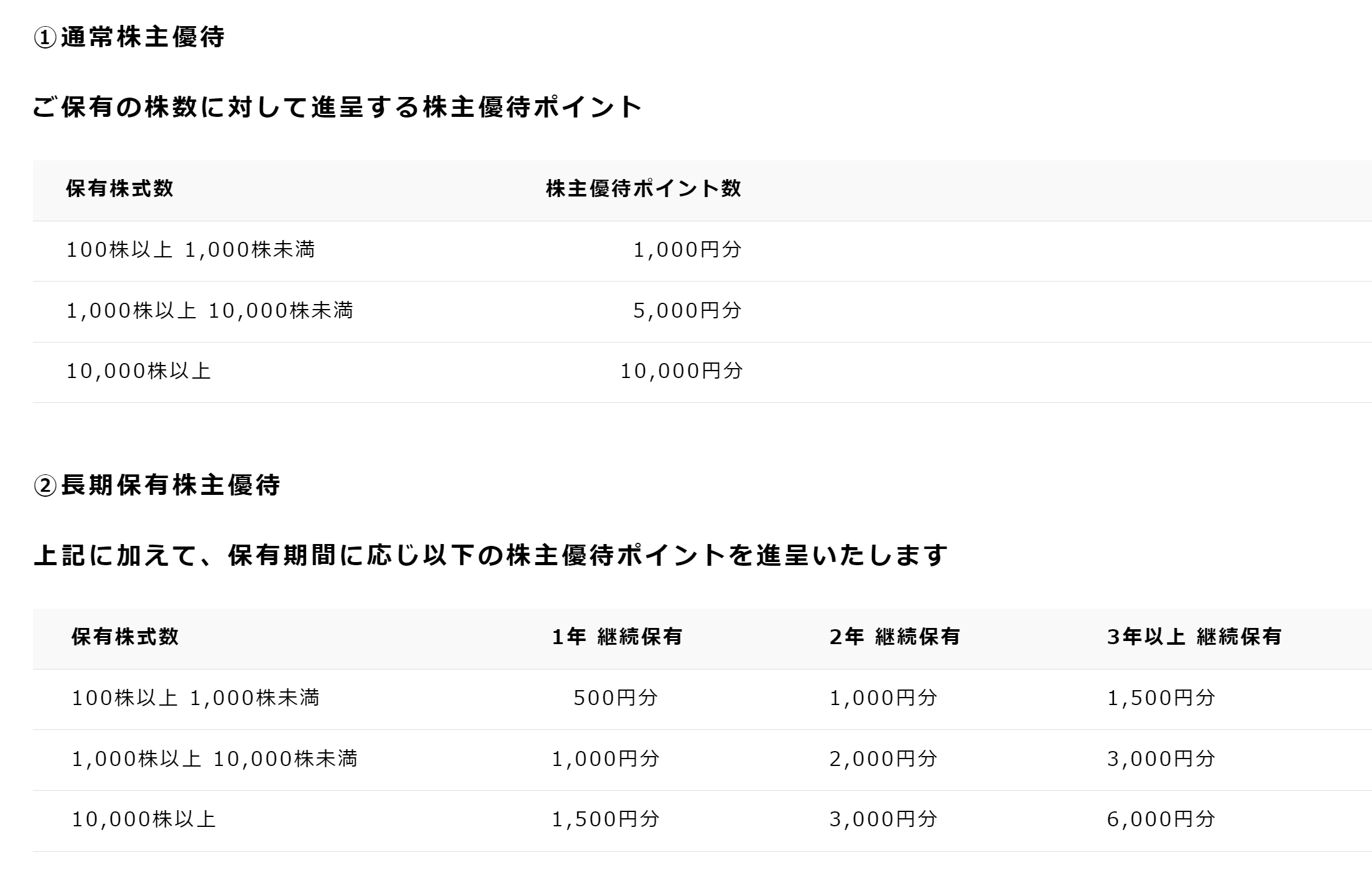 | 長期条件 | 1年以上保有で優待グレードアップ |