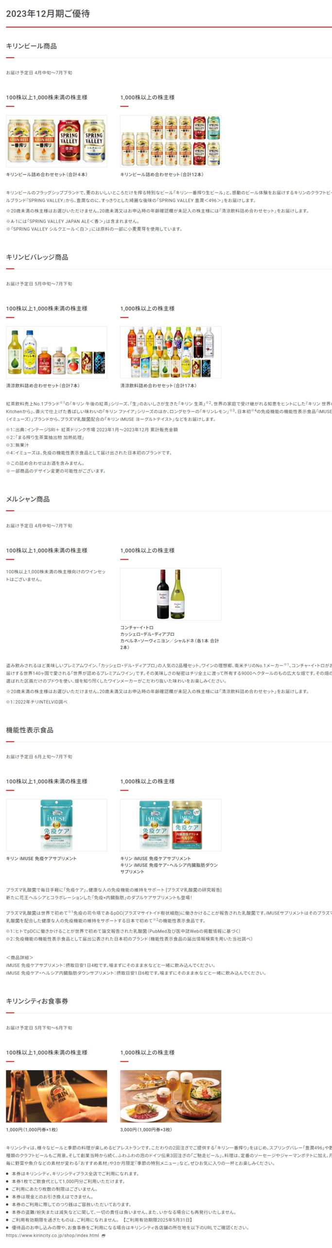 | 優待内容 | 1つ選択 ・ビール詰め合わせ ・清涼飲料水詰め合わせ ・機能性表示食品 ・キリンシティ食事券 |