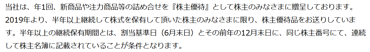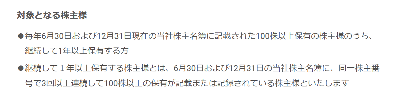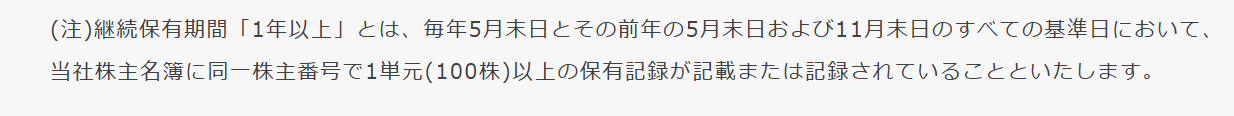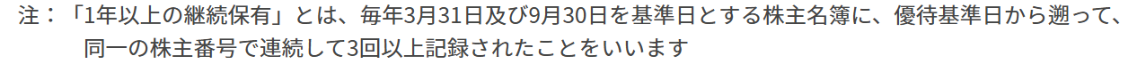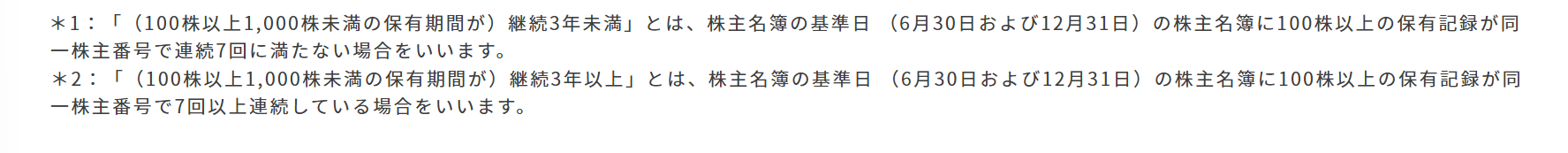 | 条件詳細 (会社HP) | 「保有期間1年以上」とは、株主名簿基準日(6月30日および12月31日)の株主名簿に連続3回以上記載さ れた同一株主番号の株主様をいいます。 |