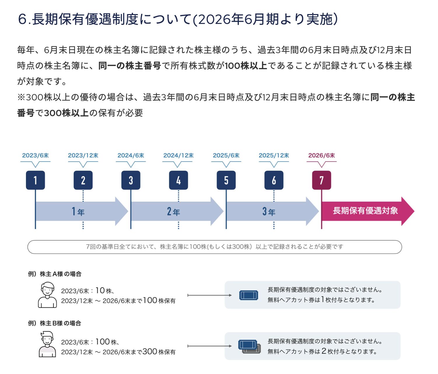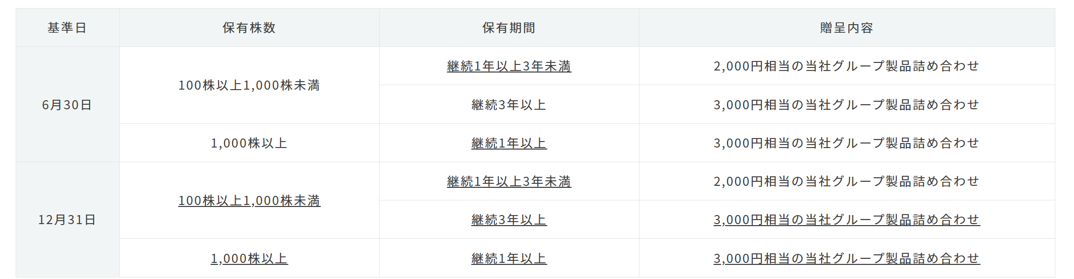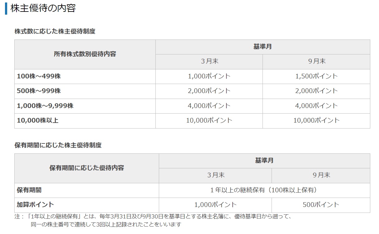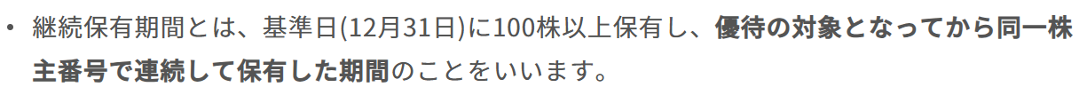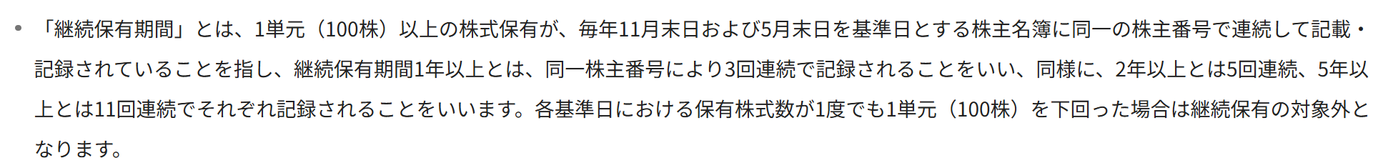 | 条件詳細 (会社HP) | 継続保有期間とは、株主名簿に記載された日から毎年12月末日時点までの各基準日(原則6月末及び12月末)に、同一の株主番号で継続して当社普通株式を保有し続けた期間といたします。 |