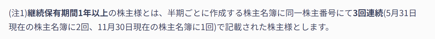 | 条件詳細 (会社HP) | 継続保有期間3年以上とは、株主名簿基準日(11月30日および5月31日)の株主名簿に連続7回以上記載または記録された同一株主番号の株主さまをいいます。 |