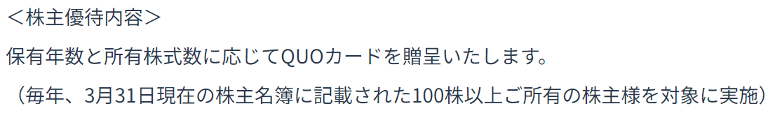 | 株数ごとの優待内容 | 詳細は下記を確認ください |