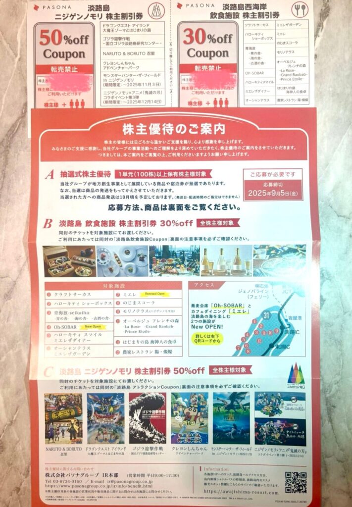 具体的には、「淡路島 飲食施設30%割引券」と「淡路島 ニジゲンノモリ50%割引券」が対象です。ただし、豪華賞品が当たる「抽選式株主優待」への応募は、100株以上の株主のみが対象となるためご注意ください。 - Q