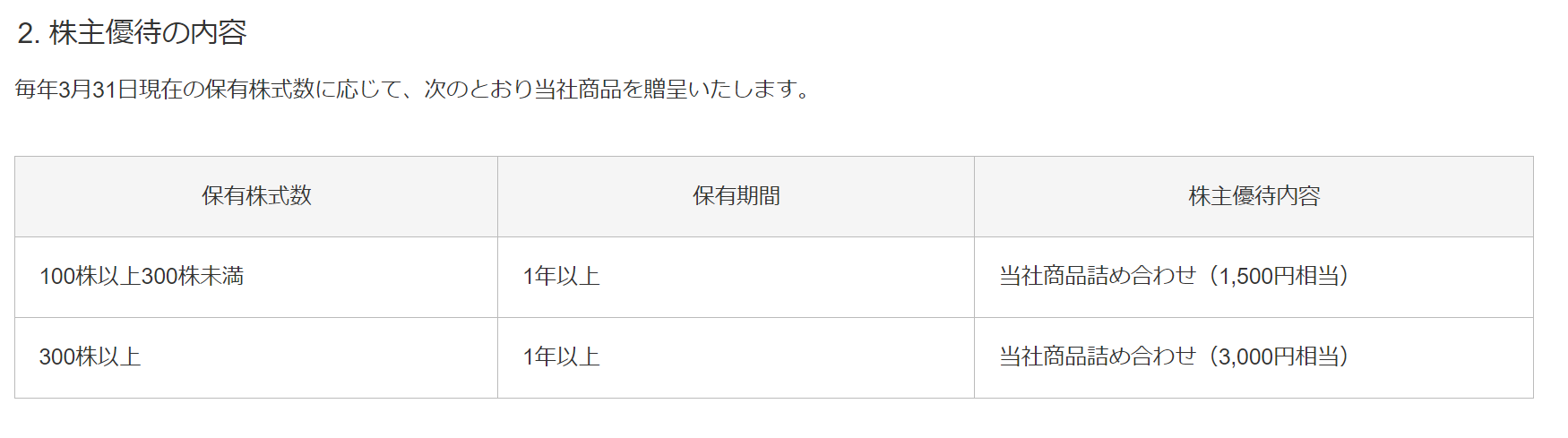 | 株数ごとの優待内容 | 詳細は下記を確認ください |